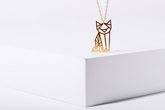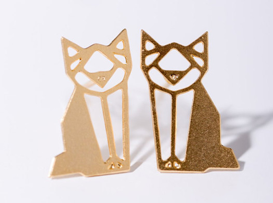 These delicate geometric kittens are the work of jewelry designer Hanan Massalha. Made from gold plated brass, the kittens are available as a pendant with a gold-filled chain for $46 or post earrings for $22. Available from the Mizyan Etsy shop.