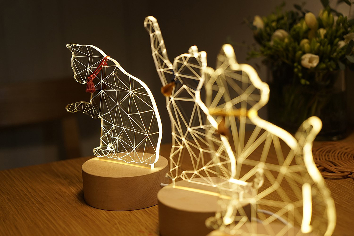 Add a lovely glow to your home with these beautiful cat lights. Perfect for a nightlight or to add a feline-themed accent to any room. Made from cut acrylic with a solid hardwood base. Subtle and elegant. Four different styles available from Amazon.com.
