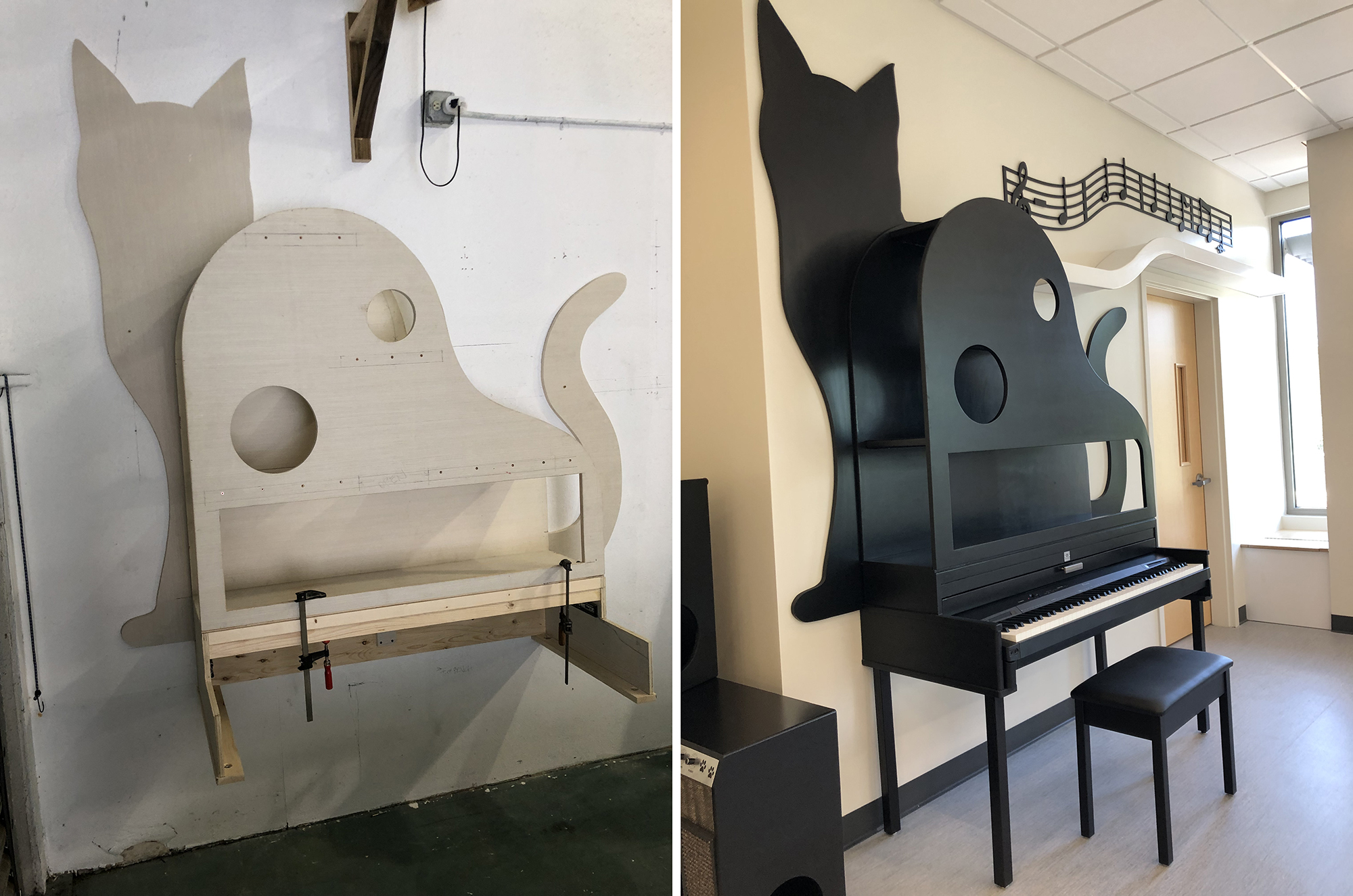 The first room is the “Piano Cat” room, where Mario designed and built an amazing piano focal point that is both a cat climber and a working piano! The baby grand piano shape is rotated vertically to create climbing and lounging spots for the cats. Mario incorporated the curve of the piano onto a giant cat silhouette on the wall. An electronic keyboard is concealed in the bottom section of the piece so staff, visitors or volunteers can entertain the cats if they wish.