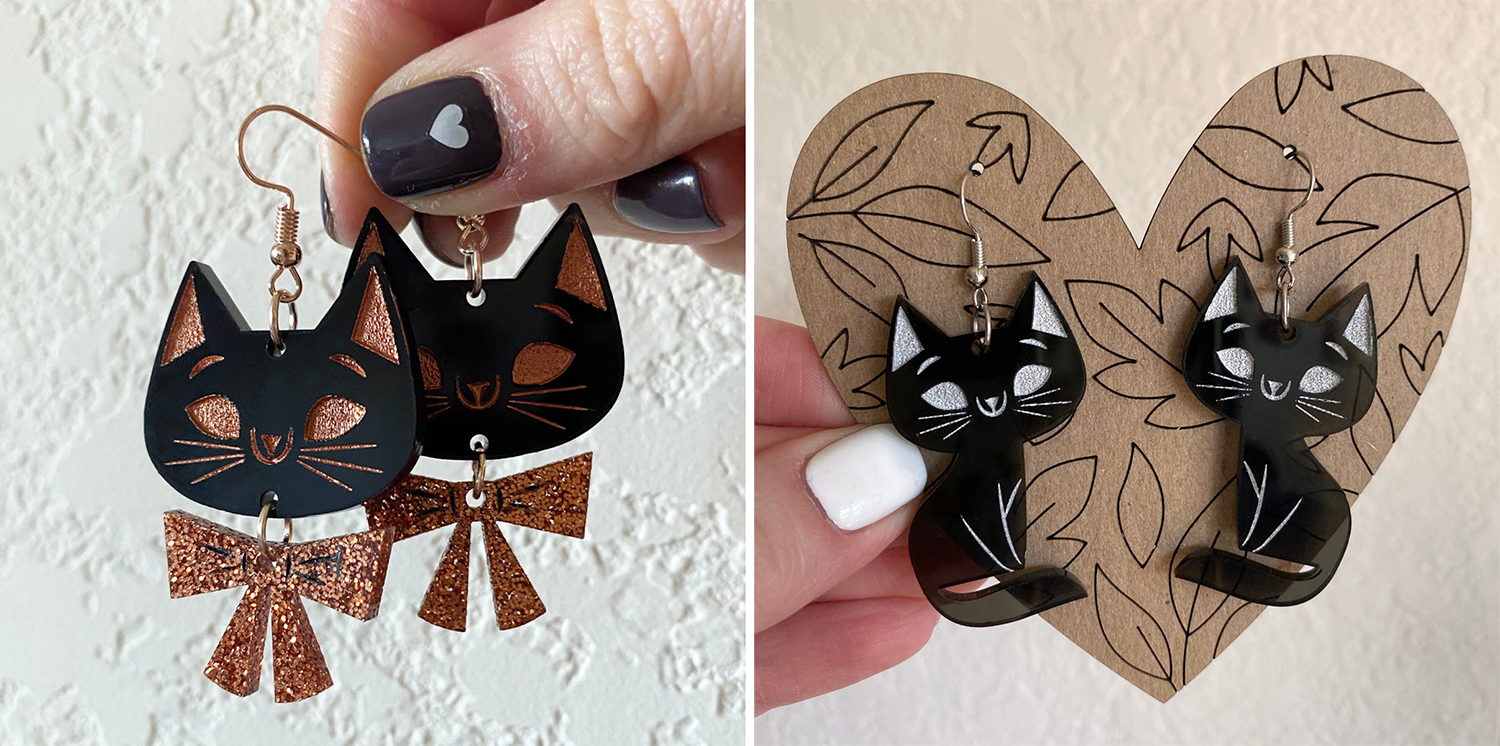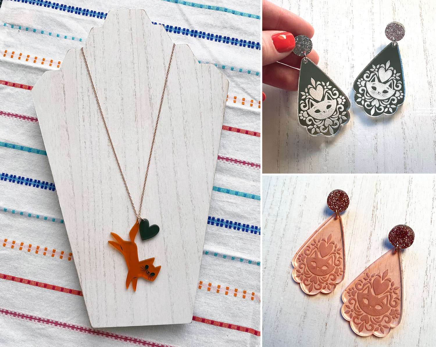 These adorable cat earrings and pendants from There Will Be Cute are perfect for your summer wardrobe. Made from lightweight acrylic with glittery accents, they are fun and festive. Available from There Will Be Cute on Etsy.