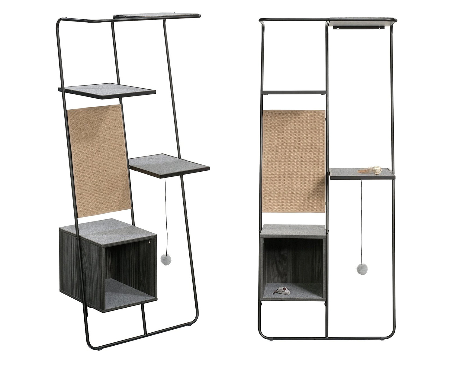 This modern cat ladder from Sauder Pet Home is perfect for small spaces. The sturdy metal frame sits on the floor and attaches to the wall at the top, stabilizing it without putting too many holes in the wall. The frame supports a climbing/hiding box, three carpeted platforms, a vertical sisal scratch pad and a hanging plush toy. It has everything cats need in a very small footprint plus the the Misted Elm finish coordinates with modern decor.