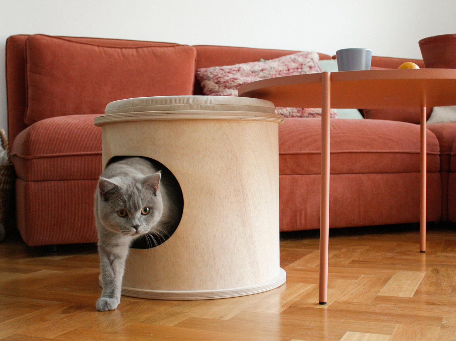 This modern cat furniture comes from Polish company Catcut, offering pieces that are designed for both you and your cat. Natural wood hideaways that double as side tables, footrests, or stools give cats a cozy place to rest that’s beautifully integrated into your decor. Choose a transparent or walnut wax finish for durability and easy cleaning. Scratching surfaces come in beige, grey, brown or black and cushions in beige or black. Available from the Catcut Etsy shop.