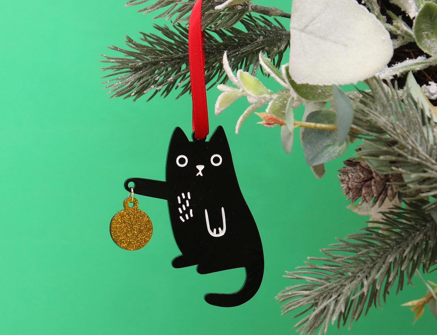 Above: Add this adorable black cat ornament from Green End Design to your tree this year. Black acrylic kitty holding a red or gold glittery ball.