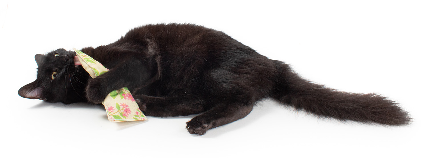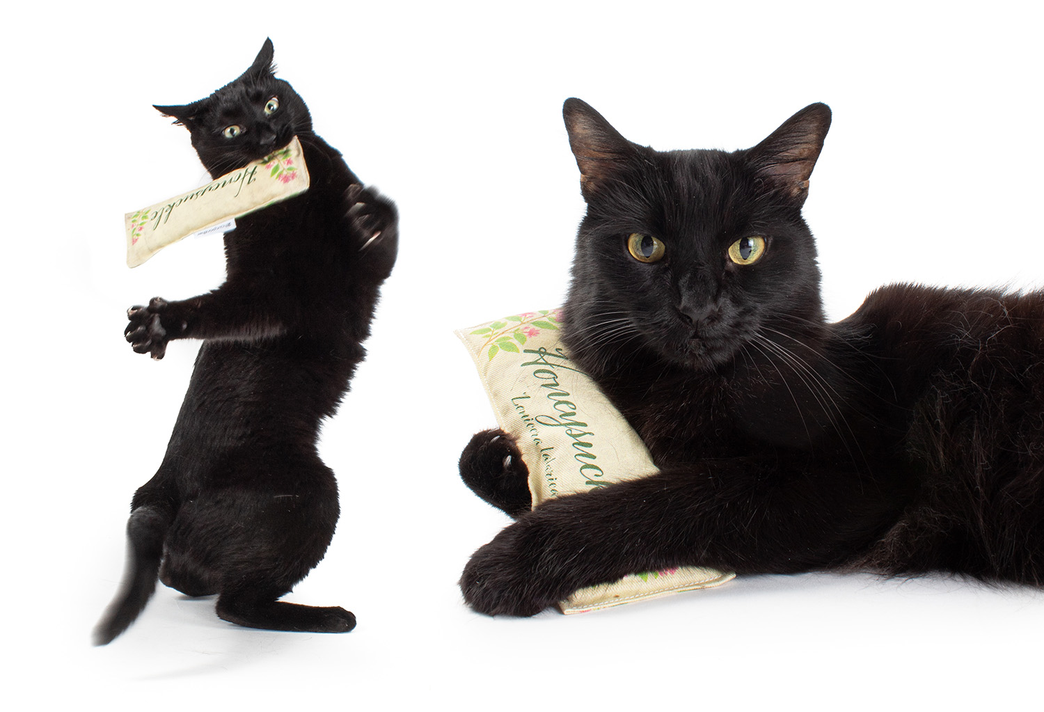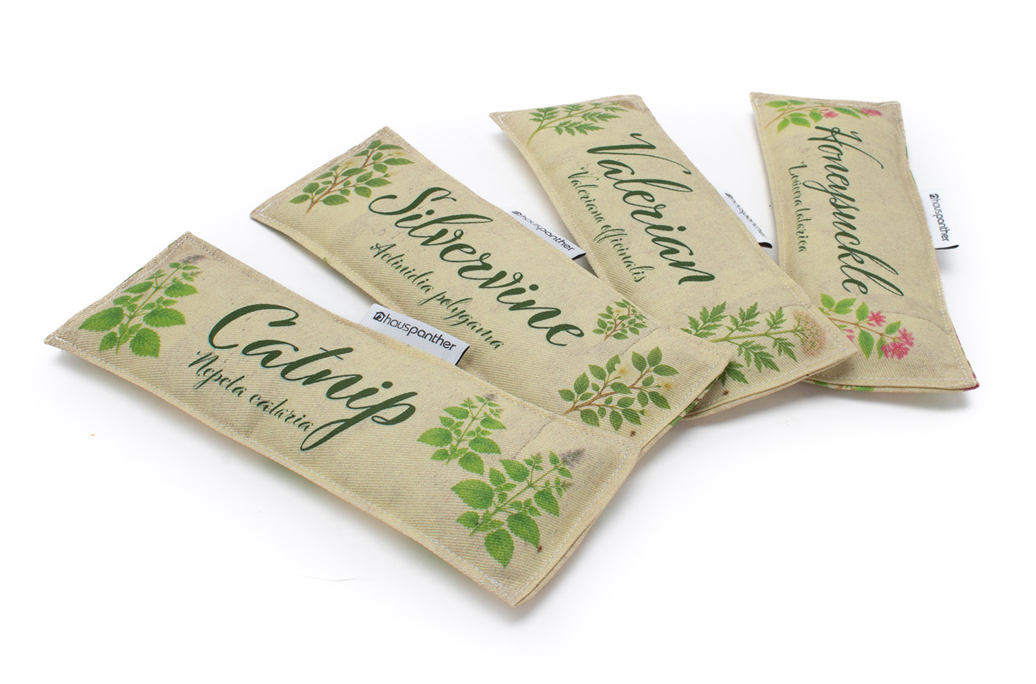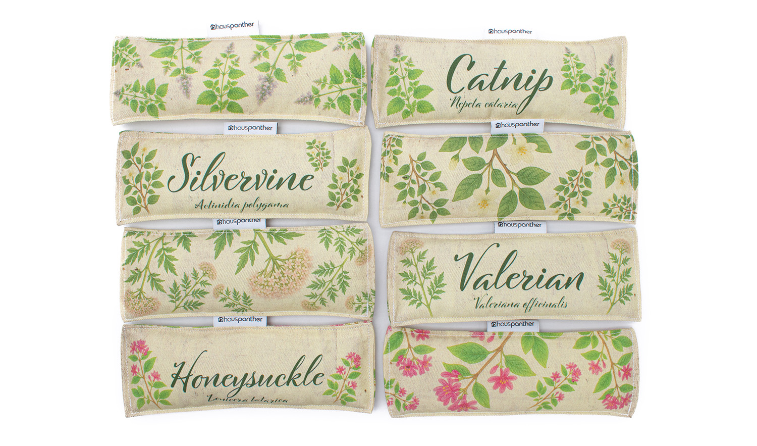 Each toy measures approximately 2.5″ x 7″ and comes in an individually sealed bag to keep the scent fresh and minimize scent mingling. Durable cotton twill fabric is printed in the USA with non-toxic inks. Toys are stuffed with herbs and a bit of polyester batting for extra kick. Available now at shop.hauspanther.com.