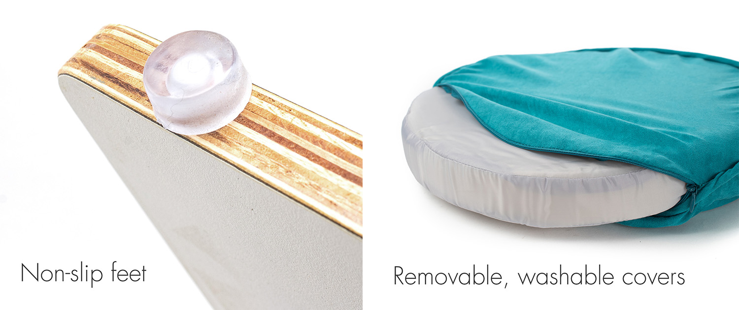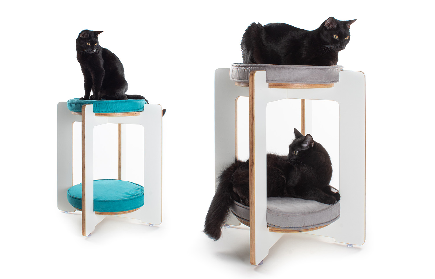 BÜNK is made from white laminated birch plywood with sealed edges. The frame measures 23″ tall by 22″ wide, the perfect height for a window perch. Two cushions are 15″ in diameter with removable, washable ultra suede covers. Non-slip feet keep BÜNK from sliding on hard floors.