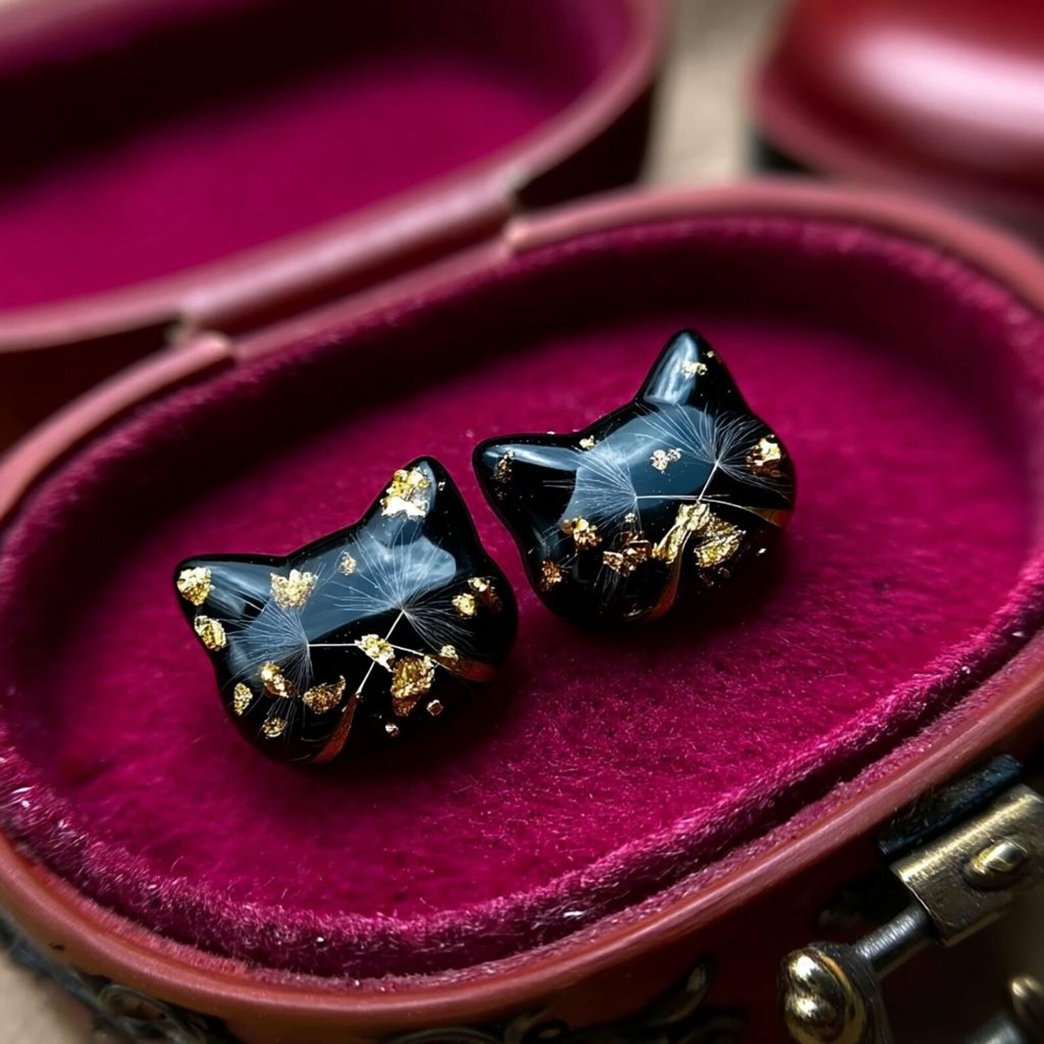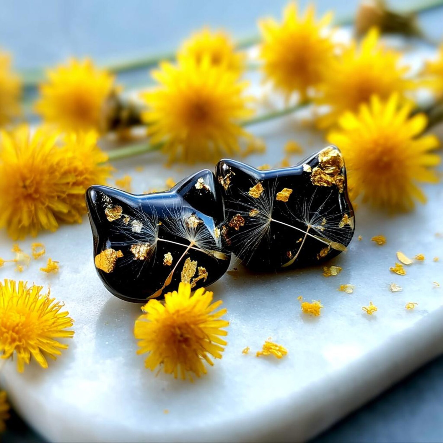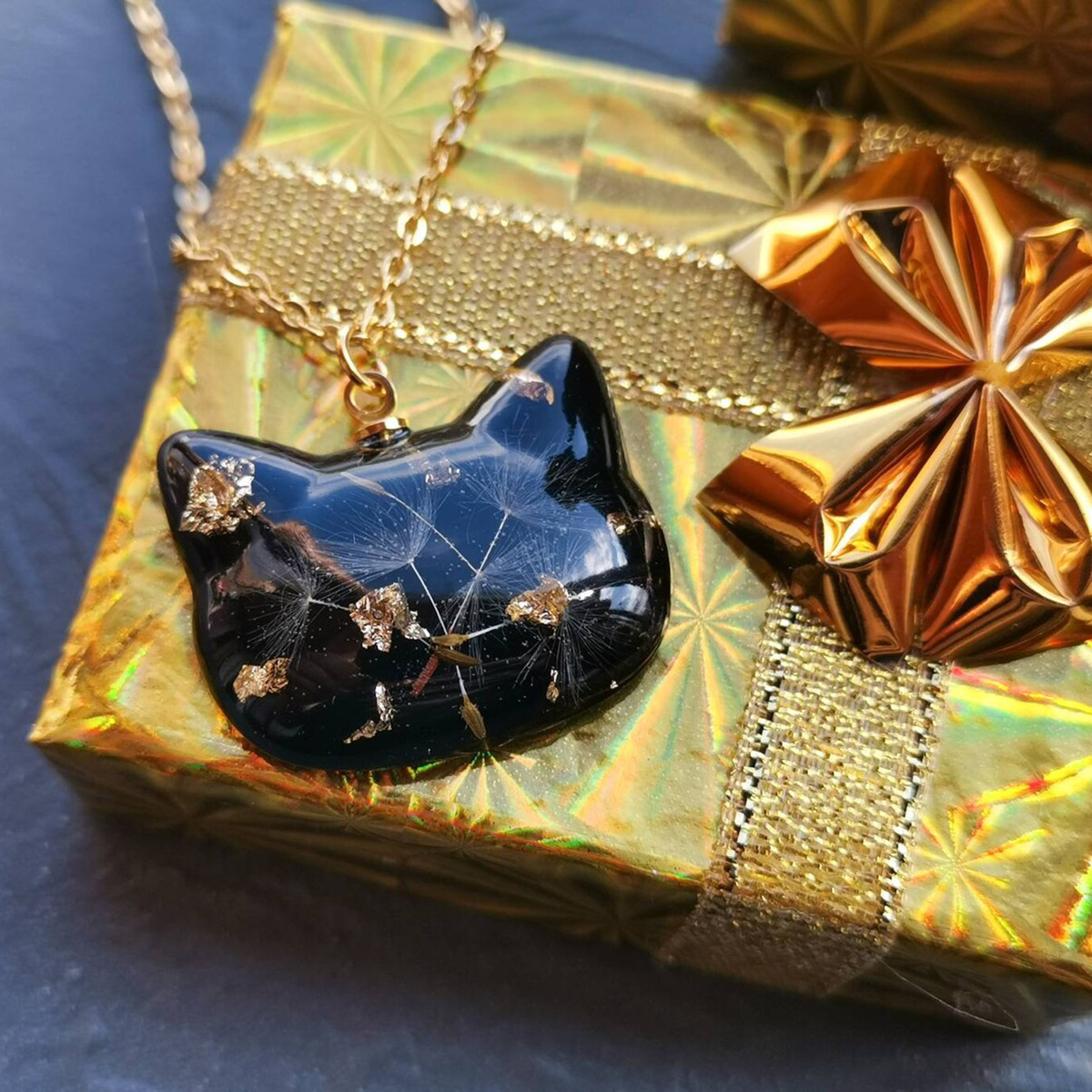 This beautiful resin jewelry caught my eye because I love simple cat shapes and interesting materials. These gorgeous creations are from Pink Bird Design in Latvia. They are made from shiny black resin with bits of gold or silver and tiny dandelion spores embedded inside. The combination is intriguing, bringing together nature with a touch of magical elegance. The cat head pendant measures about 1″ wide on a 20″ chain and the matching earrings are about a half-inch wide with stainless steel posts.