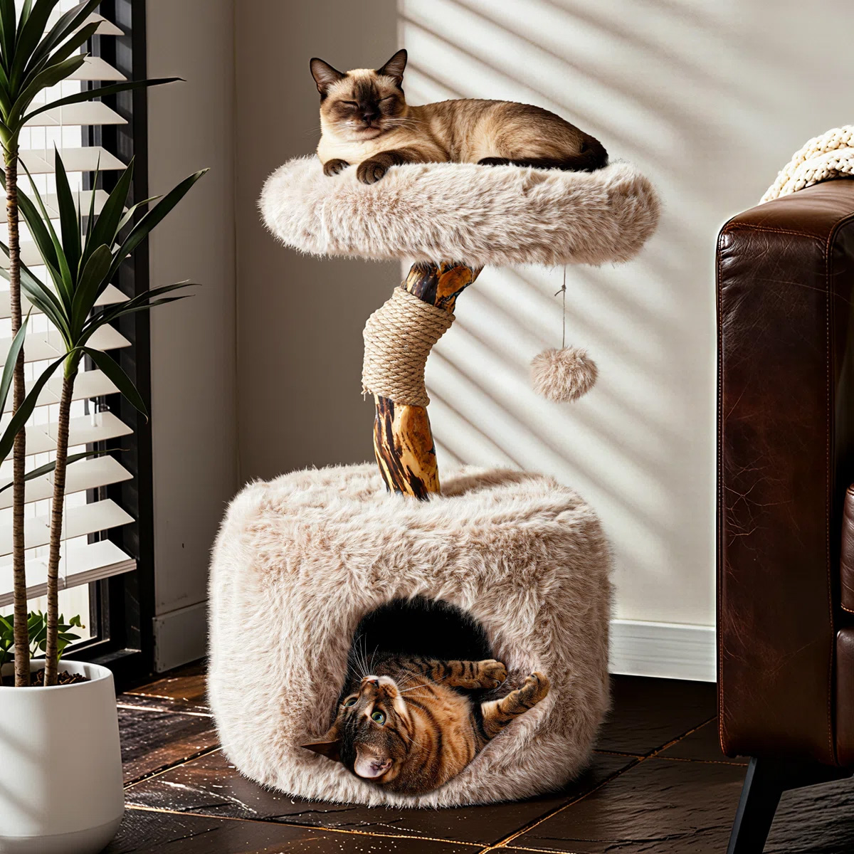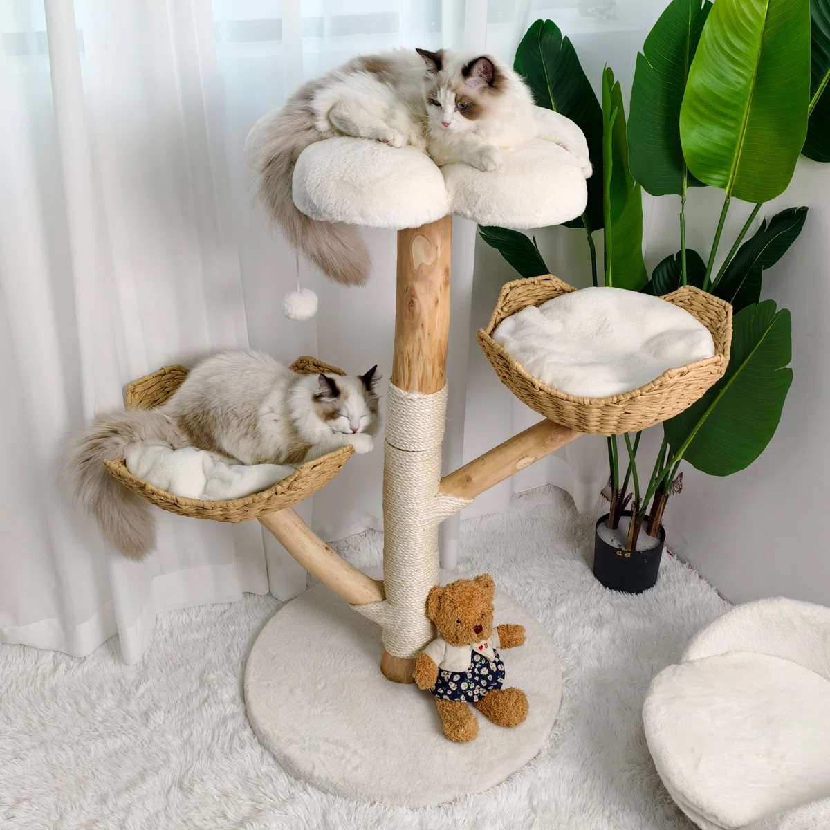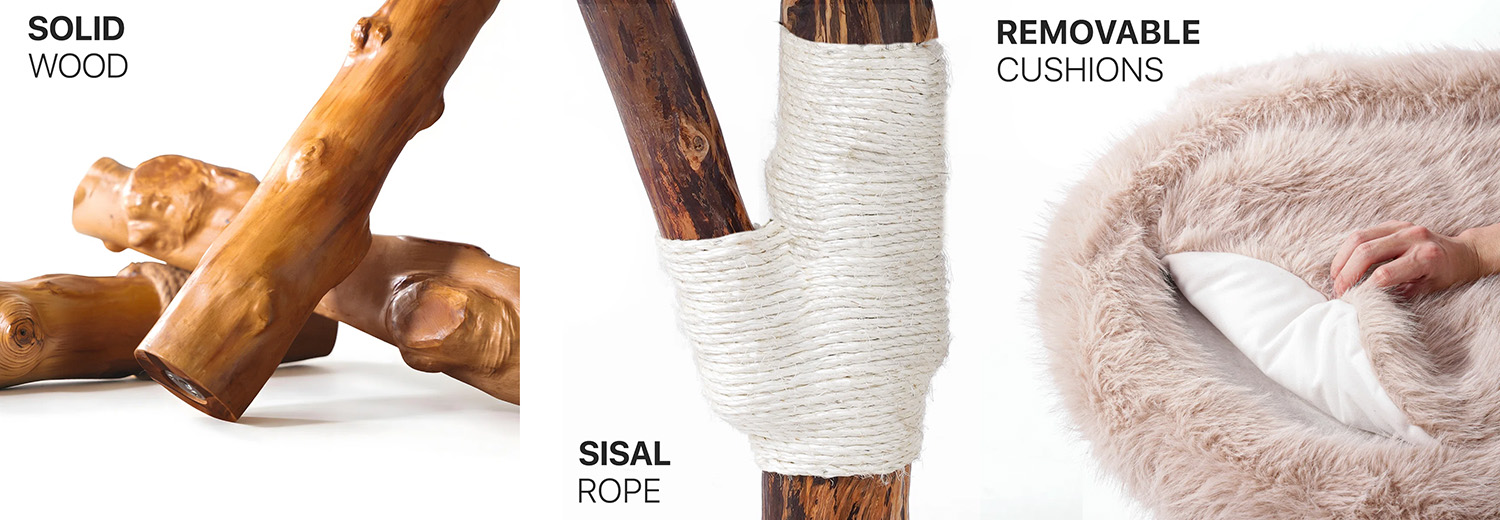 Built with substantial, hand-selected solid wood, this cat tree offers exceptional stability and a natural, sculptural look that elevates it beyond typical pet furniture. The vertical posts are tightly wrapped in durable natural sisal rope, giving your cat a satisfying place to scratch. Plush, removable cushions add a layer of comfort to each perch, creating soft, inviting spots for lounging. The cushions can be easily removed for cleaning to keep everything fresh.