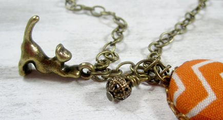 Continue readingThis unique necklace combines an antique bronze cat charm with a handmade button made from orange chevron fabric. Love it! From the Clammy’s Closet Etsy shop.